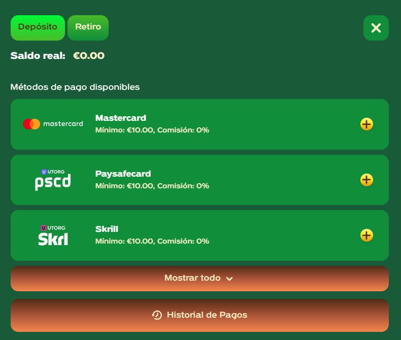 | Métodos de depósito | MasterCard, Paysafecard, Neteller, Skrill, Jeton, Mifinity, criptomonedas (+11) |